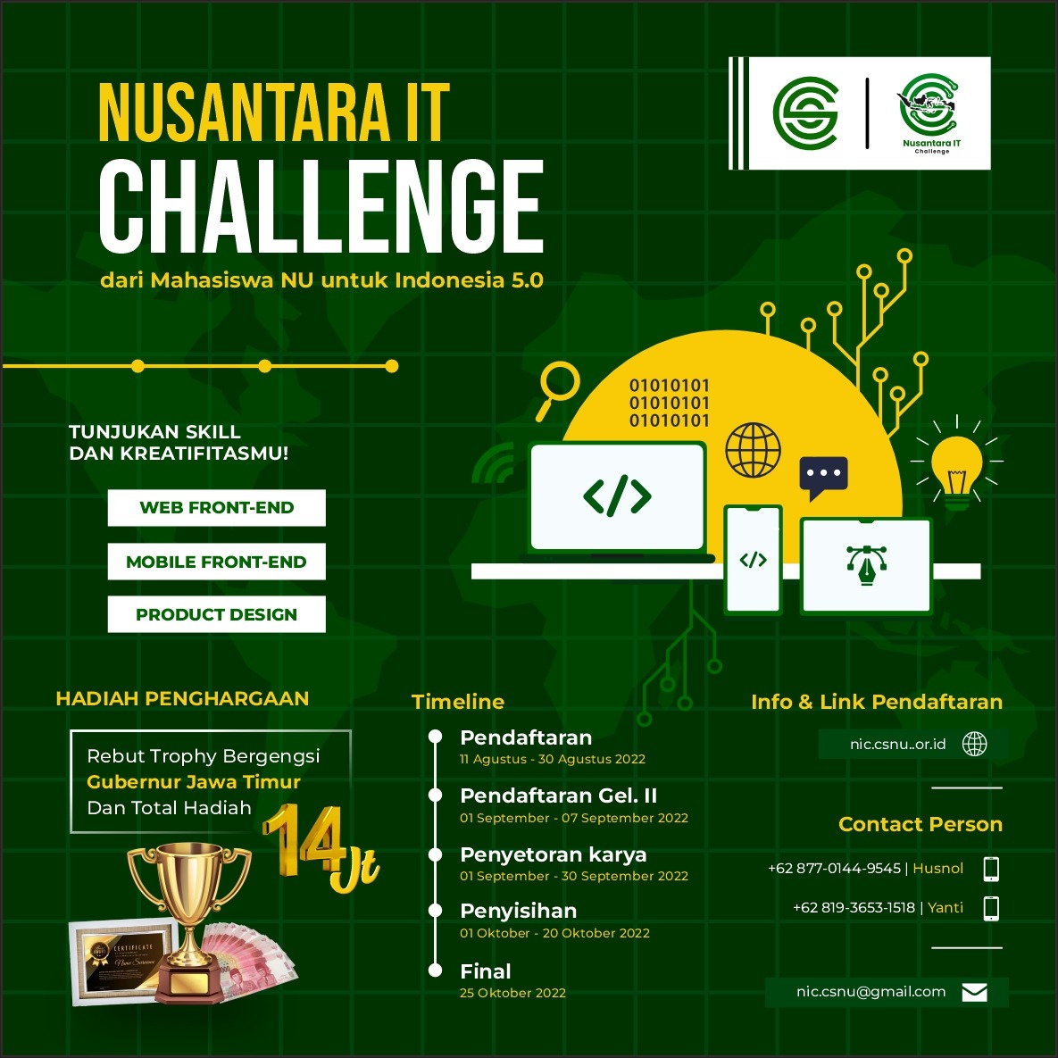 Nusantara IT Challenge 2022 merupakan salah satu usaha untuk meningkatkan kapasitas kelembagaan Perguruan Tinggi Nahdlatul Ulama dari segi peningkatan prestasi mahasiswa. Nusantara IT Challenge pada tahun 2022 hadir dalam rangka event khususnya pada bidang Teknologi Informasi dan Komunikasi bagi mahasiswa di lingkungan perguruan tinggi Nahdlatul Ulama.